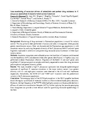 Methods: Anopheles mosquitoes were collected across nine localities in Cameroon and dissected into the head/thorax (H/T) and abdomen (Abd) after species identification. A TaqMan assay was performed to detect Plasmodium infection. Fragments of the Kelch 13 and mdr1 genes were amplified in P. falciparum positive samples and directly sequenced to assess their drug resistance polymorphisms and genetic diversity profile.